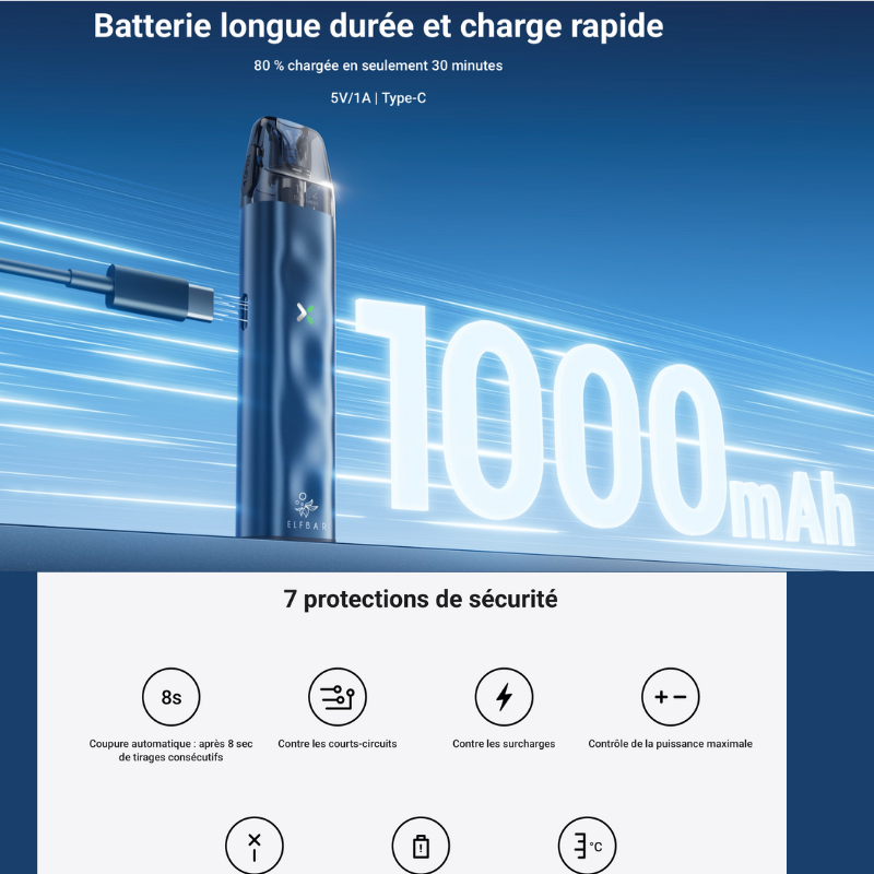 - 1 Cartouche scellé rechargeable Elfx 0.8Ω (pré-installé).