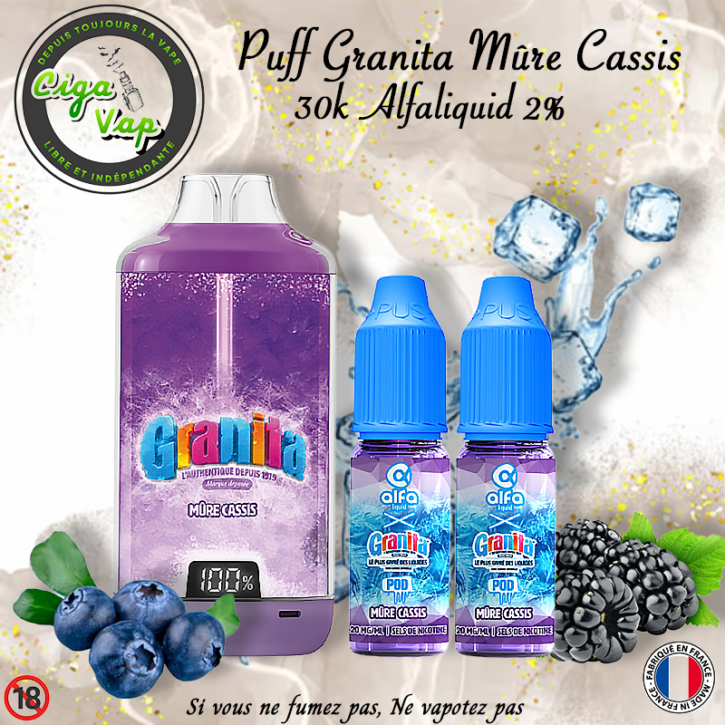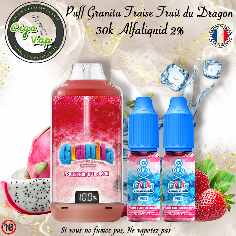 Puff Le Puff Granita Pod 30K est un kit de cigarette électronique rechargeable inspiré des boissons granita glacées, produit en collaboration avec Alfaliquid. Il est livré prêt à l’emploi avec deux e-liquides de 10 ml en sels de nicotine à 20 mg/ml, pour une utilisation simple en inhalation indirecte (MTL)